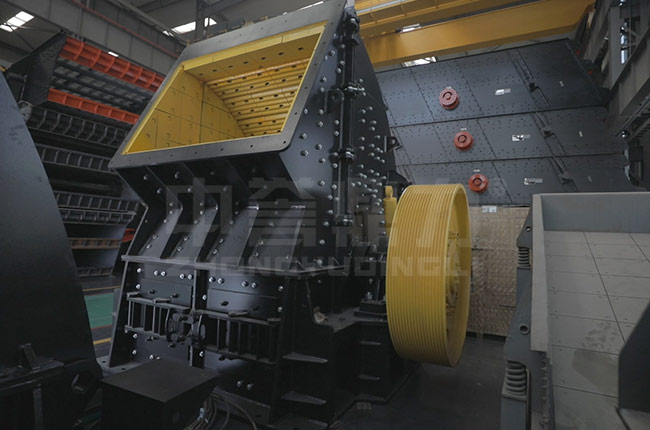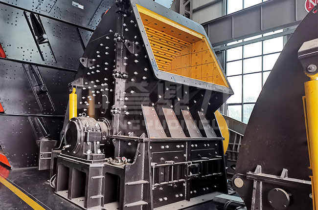 大塊原料通過給料機均勻的進入重錘破碎機的破碎腔,進入破碎腔后物料會先由高速旋轉的錘頭進行打擊完成初次破碎,同時會被打擊到機殼內部的襯板上再次進行破碎,直到小于出料口縫隙的物料從出料口排出,大于出料口的物料會重復上面的破碎,繼續(xù)被錘頭打擊,直到小于出料口被排出。