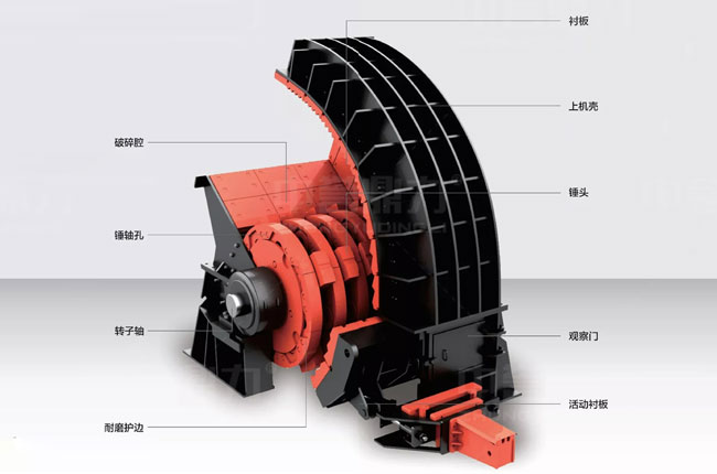 重型錘式破碎機的結(jié)構(gòu)是由破碎腔、錘軸孔、錘頭、襯板、上機殼、護邊、觀察門、轉(zhuǎn)子軸、活動襯板等部件組成的。