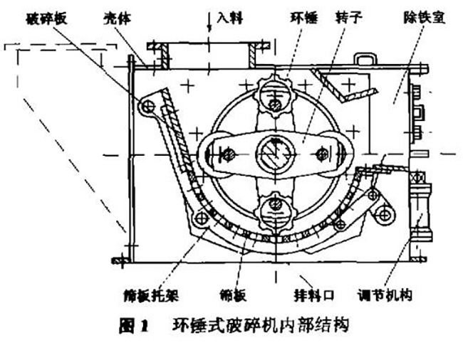 從以上KRC800環(huán)錘式破碎機結構圖我們看到,設備的主軸上安裝有數(shù)排掛錘體,在其圓周的銷孔上貫穿著銷軸,用銷軸將錘頭鉸接在各排掛錘體之間,錘頭磨損后可調(diào)換工作面。掛錘體上開有兩個銷孔。銷孔至回轉(zhuǎn)軸心的距離是不同的,可以用來調(diào)整錘頭和篦條之間的間隙。轉(zhuǎn)子兩段支撐在滾動軸承上,軸承有螺栓固定在機殼上。主軸和電動機用彈性聯(lián)軸器連接。