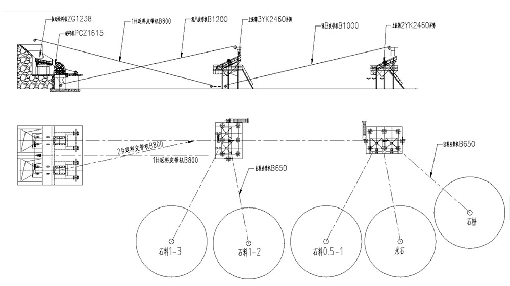 流程描述:大塊石料由DLZG1238振動給料機(jī)均勻、連續(xù)的輸送到DLPCZ1615重錘破進(jìn)行粗碎,粗碎后的混合料由1.2米的混料輸送帶送到一臺3YK2460振動篩進(jìn)行篩分,篩分出1-3和1-2兩種成品石子,大于31.5mm的由一條800的返料輸送帶送回到破碎機(jī)再次破碎,小于1-2的石料輸送到二道篩再次篩分,篩分出0.5-1石子、米石和石粉三種成品料。