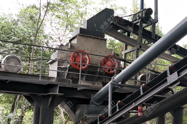 方案二:適合石灰石、青石、煤矸石等中低硬度或者脆性物料的制砂作業(yè),重錘破可將大塊物料直接破碎到30mm以下用來制砂,設(shè)備投資成本低。