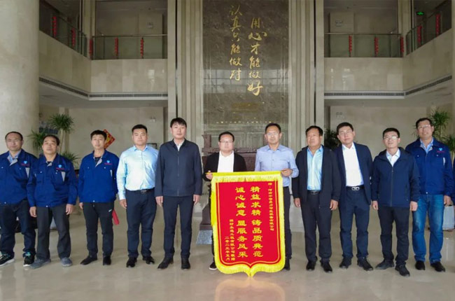考察團(tuán)來到中譽(yù)鼎力廠區(qū)后,首先送上了感謝錦旗,盛贊中譽(yù)鼎力“精益求精,鑄品質(zhì);誠(chéng)心誠(chéng)意,顯服務(wù)風(fēng)采”。