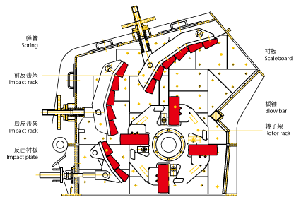 錘破:經(jīng)給料機進入破碎機進料口的礦料,在高速旋轉(zhuǎn)的錘頭的作用下被次破碎,之后反彈,又以高速撞擊在反擊板上進一步被破碎,在整個過程中,礦石受到多次破碎,破碎合格的礦料經(jīng)過篩條裝置排出,不合格的礦料繼續(xù)留在破碎腔破碎,大塊石料在破碎腔內(nèi)受到多次破碎,合格的礦料被及時排出,不會出現(xiàn)過粉碎現(xiàn)象。