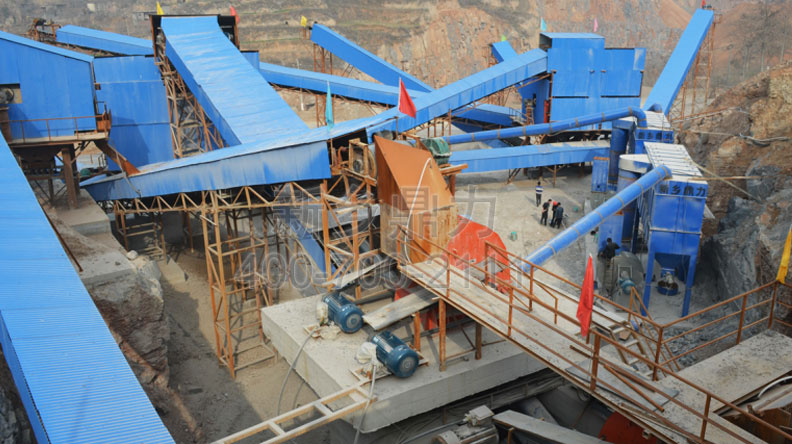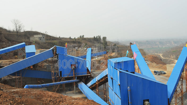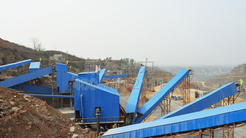 此條生產(chǎn)線時(shí)產(chǎn)700噸;基本配置:PCZ1615重型錘式破碎機(jī)、PC1512錘式破碎機(jī)、ZG2038給料機(jī)、3YKZ3070×2振動(dòng)篩、2YKZ3070×2振動(dòng)篩。