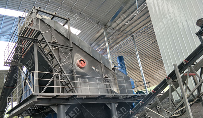 原料經(jīng)皮帶輸送機(jī)從雙轉(zhuǎn)子制砂機(jī)ZSJ0808上方落入機(jī)腔進(jìn)行破碎,破碎后的物料經(jīng)一條皮帶輸送機(jī)送到一臺(tái)3YKZ2060振動(dòng)篩進(jìn)行篩分,篩分出5mm和小于3.8mm兩種成品砂,大于5mm的被一條返料輸送帶返回到制砂機(jī)進(jìn)行再次加工,形成一個(gè)閉路循環(huán)。