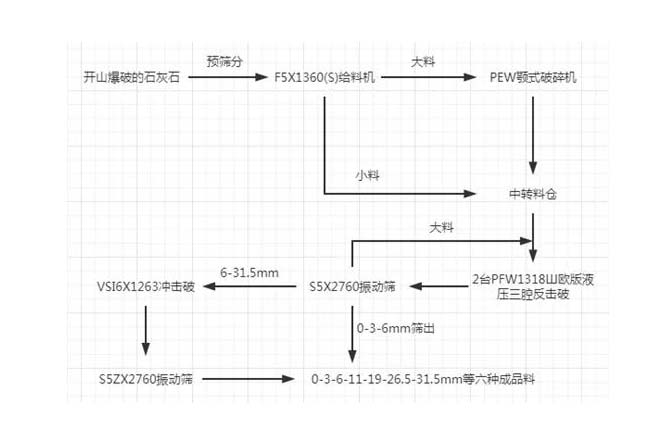 主機設(shè)備:PEW顎式破碎機、2臺PFW反擊破碎機、VSI6X制砂機