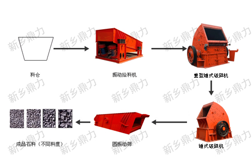 石子生產(chǎn)線主要分為給料、破碎、篩分三個環(huán)節(jié),其主要設(shè)備有振動給料機、破碎機、整形機及振動篩。大塊石頭從料倉進(jìn)入給料機之后,物料再由振動給料機均勻的喂入破碎機之后進(jìn)行破碎,破碎之后的物料通過皮帶輸送機進(jìn)入整形機內(nèi)進(jìn)行整形,后進(jìn)行篩分,直到篩出符合要求的成品料即可,不符合要求的需要再次進(jìn)入破碎機重新破碎。詳細(xì)的流程和設(shè)備可以參考下圖: