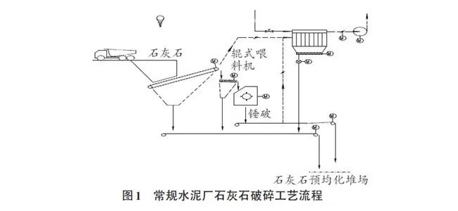該水泥廠原有石灰石碎石生產(chǎn)線為重型板式喂料機(jī)+波動(dòng)輥式喂料機(jī)+重錘式破碎機(jī)體系,聯(lián)合粉碎能力通常在900~1100噸/時(shí),工藝流程見圖1:
