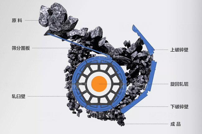 工作原理詳解:從上圖中看到,臥式旋回粗碎破碎機(jī)內(nèi)部主要由篩分篦板、上破碎壁、下破碎壁、偏心軸、旋回軋輥、軋臼壁部分組成,原料經(jīng)振動(dòng)給料機(jī)輸送至機(jī)腔內(nèi)部之前,經(jīng)過(guò)篩分篦板,會(huì)提前篩分出較小粒級(jí)的石料,直接從機(jī)器后方落下。其余物料進(jìn)入破碎腔,旋回軋輥在偏心軸的帶動(dòng)下高速旋轉(zhuǎn),并來(lái)回?cái)[動(dòng),當(dāng)軋輥靠近破碎壁,與之間隙變小,經(jīng)過(guò)多次擠壓、沖擊物料完成破碎,當(dāng)軋輥離開(kāi)該區(qū)段時(shí),軋輥和破碎比之間的間隙變大,被擠壓過(guò)的物料順著間隙流出機(jī)腔。